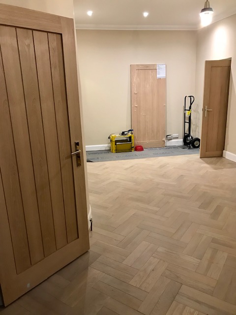 This gallery showcases our comprehensive building services, from structural work to fine interior finishes. Featured projects include herring bone flooring installations, custom kitchen fittings, quality door and window installations, and complete building extensions.